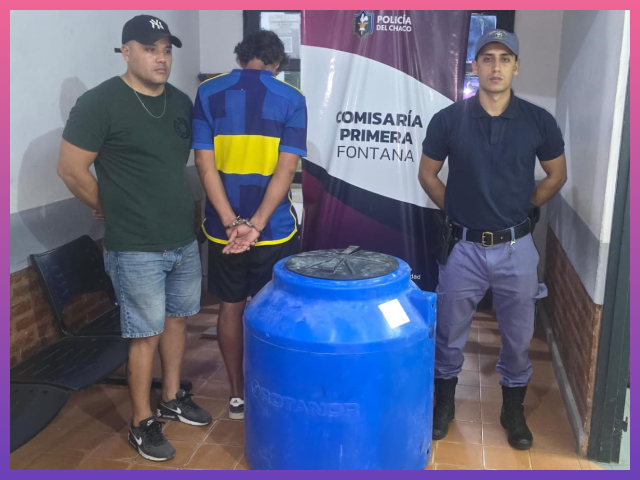 Este miércoles a las 1:10 efectivos de la Comisaría Primera de Fontana lograron la detención de un hombre de 45 años, que ofrecía en inmediaciones de la avenida 25 de Mayo y Calle Italia, un tanque de agua . El procedimiento se realizó tras la denuncia de un vecino de 52 años, quien había informado el robo de un tanque de agua de 300 litros, color azul, desde una obra en construcción en Calle Bolivia N° 550.