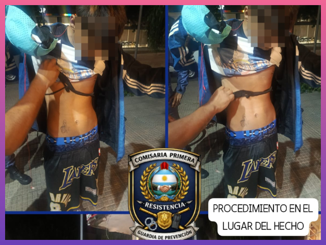 Cerca de las 2, efectivos de la Comisaría Primera de Resistencia demoraron a un joven de 18 años en la intersección de José María Paz y Obligado. Los agentes constataron que el joven llevaba oculta una pistola de aire comprimido, réplica calibre 9 mm, color negro, asegurada a la altura del tórax mediante un corpiño negro.