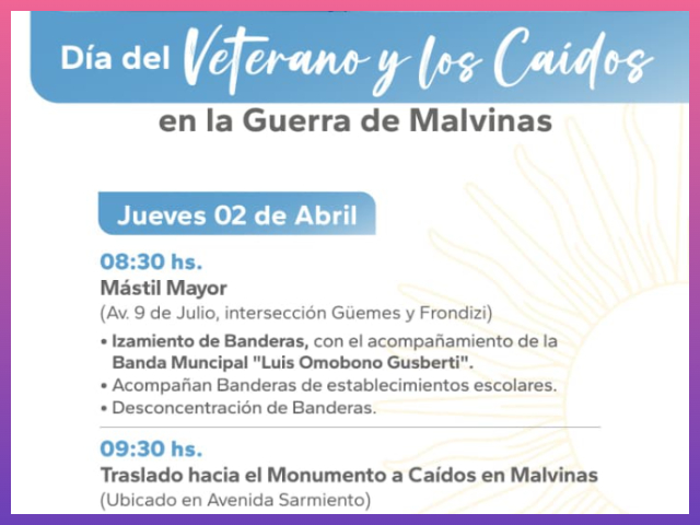 En tanto, que el acto oficial se llevará a cabo a las 9.30 horas, en el Monumento a los Caídos, ubicado en avenida Sarmiento, metros antes de llegar a la autovía Nicolás Avellaneda. Allí se depositará una ofrenda floral, se hará una oración y los excombatientes compartirán su testimonio.