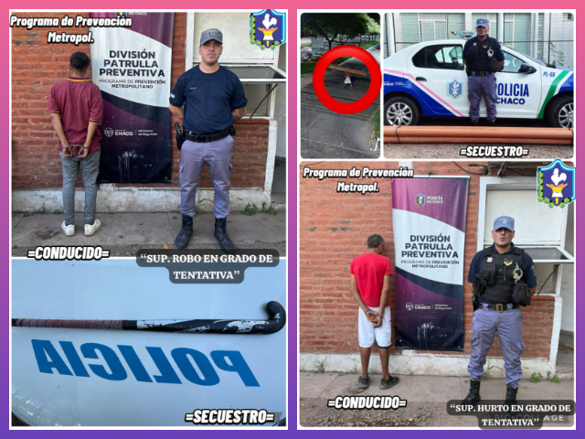 Esta mañana, cerca de las 8, los agentes de la división Patrulla Preventiva de Resistencia intervinieron en dos hechos delictivos que quedaron en el intento. Primero detuvieron a un joven por el intento de robo de un palo de hockey desde un auto estacionado. Casi al mismo tiempo demoraron a un hombre que intentaba llevarse unos tubos de PVC de una obra en construcción por avenida San Martín. Ambos sospechosos fueron detenidos.