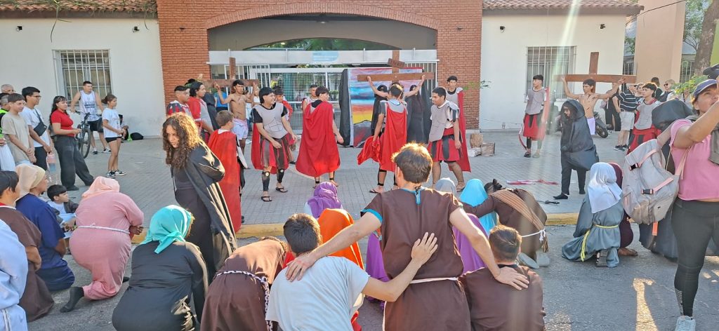 A lo largo de la caminata se desarrollaron las 15 estaciones del Vía Crucis, en un trayecto que cada año convoca a creyentes, familias, jóvenes y adultos que deciden vivir el Viernes Santo de una manera especial: caminando, rezando y reflexionando sobre la Pasión de Cristo.