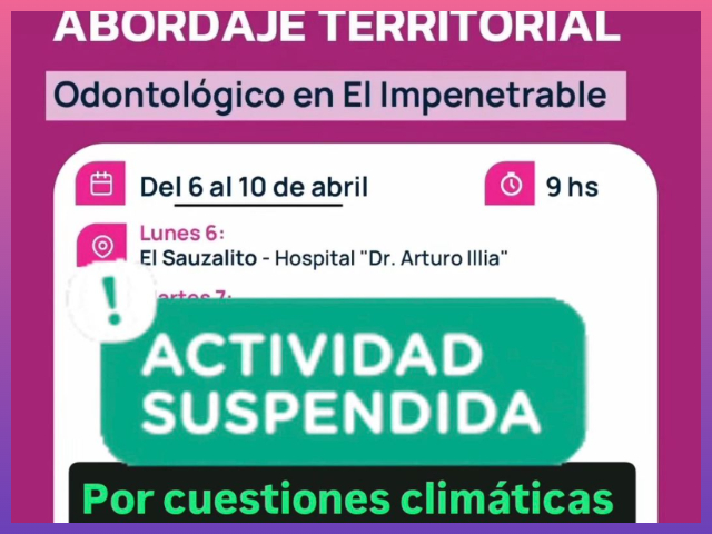 El Gobierno provincial informa la suspensión del Operativo de Abordaje Territorial Odontológico, que estaba previsto del 6 al 10 de abril en la región de El Impenetrable.