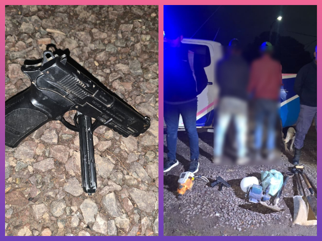 Durante el palpado preventivo, los agentes hallaron entre las prendas de uno de ellos una réplica de arma de fuego de aire comprimido, similar a una pistola Bersa Thunder 9 Pro, la cual fue secuestrada junto a otros objetos, como ser, cinco palas (tres de ellas anchas), dos bombas de agua y un taladro, elementos cuya propiedad no pudo ser justificada por los demorados al momento del procedimiento.