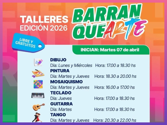 19-Mar-26 El Centro Cultural La Flota abrió las inscripciones para una nueva edición de BarranqueARTE 2026, una propuesta artística y comunitaria destinada a niños, jóvenes y adultos de la ciudad.