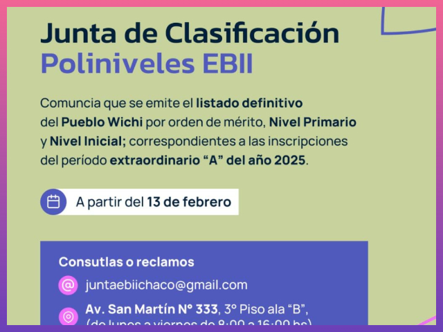 20-Feb-26 El Ministerio de Educación, a través de la Junta de Clasificación Poliniveles para la Educación Bilingüe Intercultural Indígena (EBII), informó a los docentes del Pueblo Wichi inscriptos en el Período Ordinario A 2025-2026 de los niveles Inicial y Primario que desde el 13 de febrero del corriente año se encuentra disponible el listado definitivo con la valoración correspondiente.